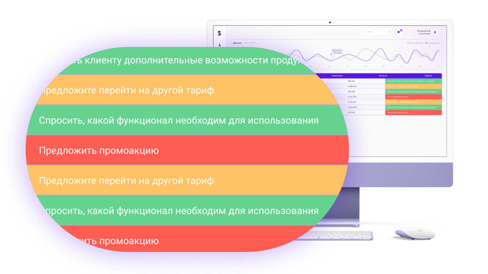 Отдел удержания и работы с клиентами работает как обычно, делает предложения, но теперь знает какие и какому клиенту, при этом приоритизирует клиентов, и более важно что система выдает алерты и сама подсказывает с каким клиентом стоит поработать